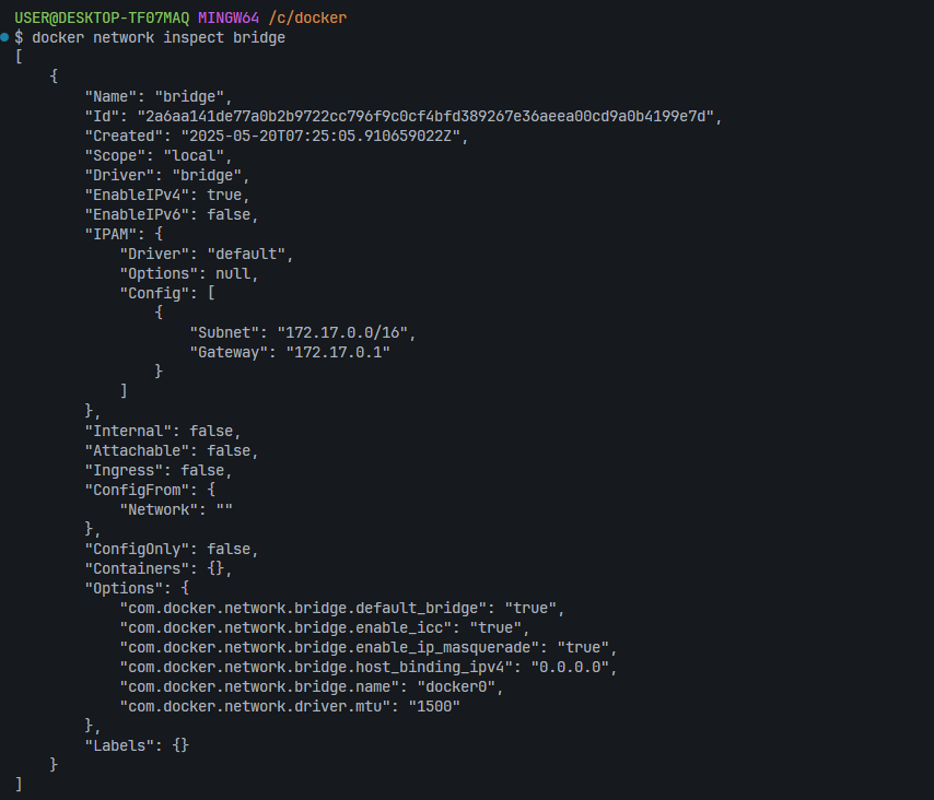 "Containers" | 해당 네트워크에 연결된 컨테이너 목록 | 각 컨테이너 ID와 IP 주소 포함 |